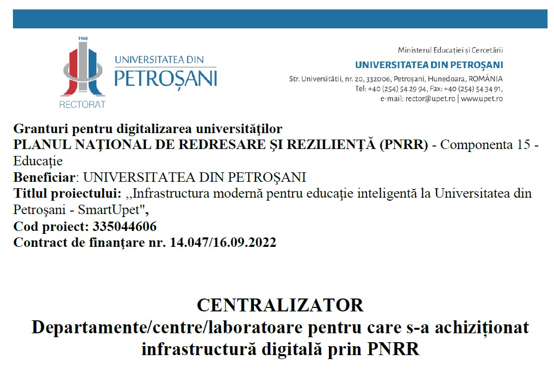 Universitatea din Petroșani implementează, în perioada octombrie 2022- decembrie 2025, proiectul cu titlul ”Infrastructură modernă pentru educație inteligentă la Universitatea din Petroșani – SmartUpet” (cod 335044606) finanțat de Ministerul Educației în cadrul Apelului corespunzător Planului Național de Redresare și Reziliență, Componenta C15 – Educație, Reforma 5 – Adoptarea cadrului legislativ pentru digitalizarea educației, Investiția 16 – Digitalizarea universităților și pregătirea acestora pentru profesiile digitale ale viito-rului.
